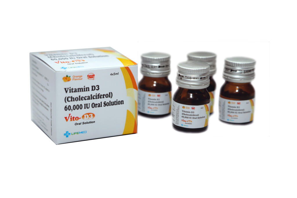 VITAMIN D DEFICIENCY IS EPIDEMIC IN INDIA, DESPITE PLENTY OF SUNS SHINES, VITAMIN D IS NECESSARY FOR GOOD HEALTH & BONES. VIT0-D3 CONTAINS VITAMIN D3 60,000 I.U ORAL SOLUTION (NANO SHOTS), AS THE CAPSULE, TABLETS & SACHETS OF VITAMIN D3 ARE USUALLY BEING TAKEN BY THE PATIENTS WITH WATER, WHICH DECREASES THE BIO AVAILABILITY OF THE DRUG, VITO-D3 WITH IS ORAL SOLUTION NEEDS NO WATER & HENCE INCREASES THE BIO AVAILABILITY OF THE DRUG. THE SUNSHINE VITAMIN FOR BETTER HEALTH & STRONGER BONES. VITO-D3 IS BEST PRESCRIBED FOR THE PATIENTS OF: OSTEOPOROSIS, OSTEOARTHRITIS, FRACTURE, BONE & MUSCLE PAIN, CORONARY HEART DISEASE, and DIABETES.